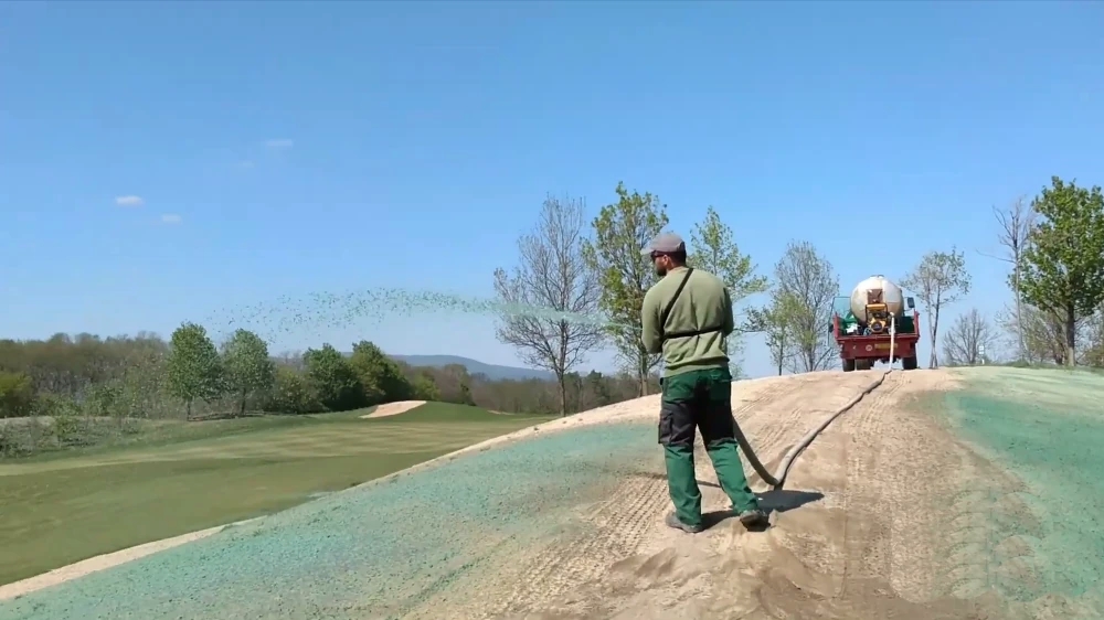- Copertura Omogenea: Grazie alla miscelazione uniforme di semi, fertilizzanti e sostanze nutritive, l’idrosemina garantisce una distribuzione regolare su ampie superfici. Questo è fondamentale per mantenere un tappeto erboso uniforme e di alta qualità su campi da golf.